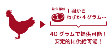 例えば「もみダレ鶏ハラミ」は一羽からわずか4グラムしか取れない超希少部位です。これを40グラムで提供します。当然10羽分になりますが、そんな希少部位を「安定的に供給する事が可能」になりました。