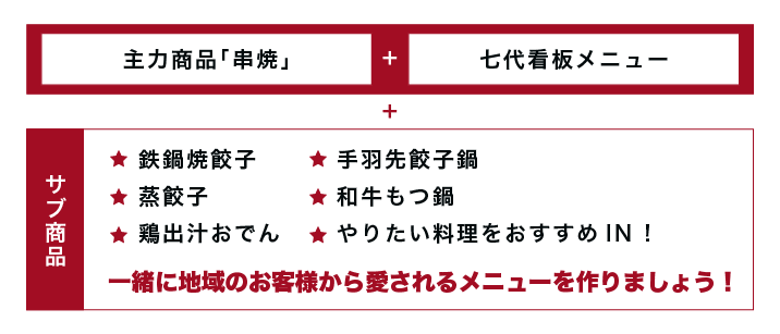 これを追及し改善改良した結果生まれたのが「七代看板料理!」この商品力が他とは一味違う串焼十八番の武器です!