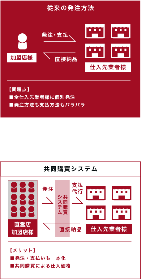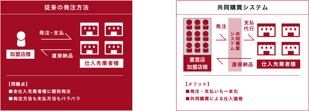 直営店同様、加盟店様にも弊社が加入する共同購買システムをご利用頂く事で仕入の簡素化とコストダウンが可能になります。